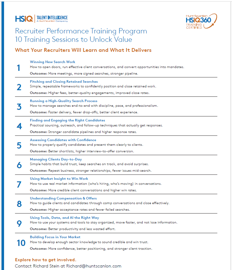 “This is not onboarding. It is not technology training, database usage, or cultural integration,” says Richard Stein, CEO of HSiQ who is spearheading the rollout this spring in the U.S., the U.K., and Europe. “It is performance enablement – a structured, repeatable system designed to materially improve how recruiters execute, win, and deliver.”